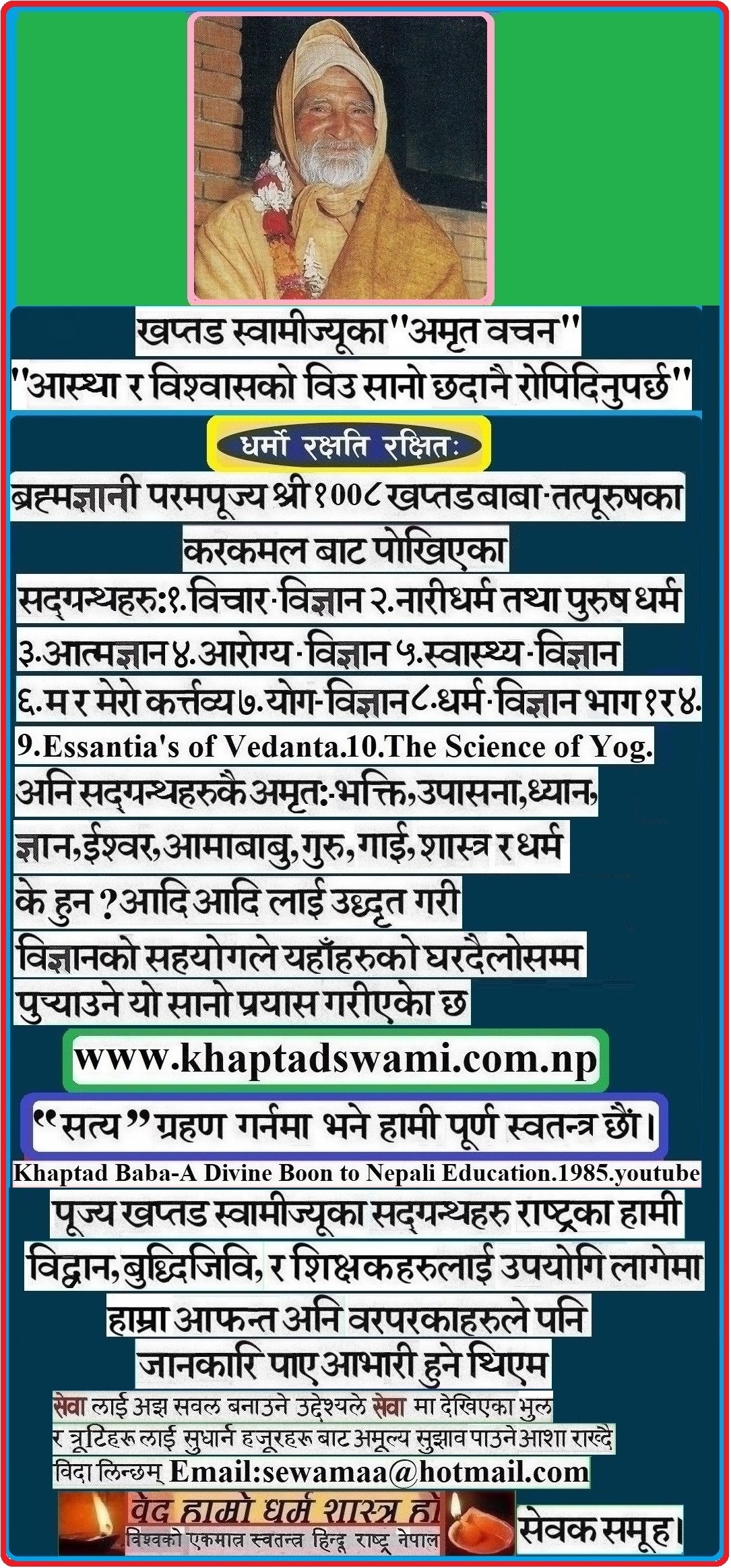 १ Essentials of Vedanta २ The Science Of Yoga ३ बिचार बिज्ञान ४ नारीधर्म तथा पुरुषधर्म ५ म र मेरो कर्तव्य ६ स्वास्थ्य विज्ञान ७ आरोग्य-बिज्ञान ८ आत्म-ज्ञान ९ धर्म-बिज्ञान (प्रथम-खण्ड) १० धर्म-बिज्ञान (चतुर्थ खण्ड) A Divine Boon to Nepali Education-1985